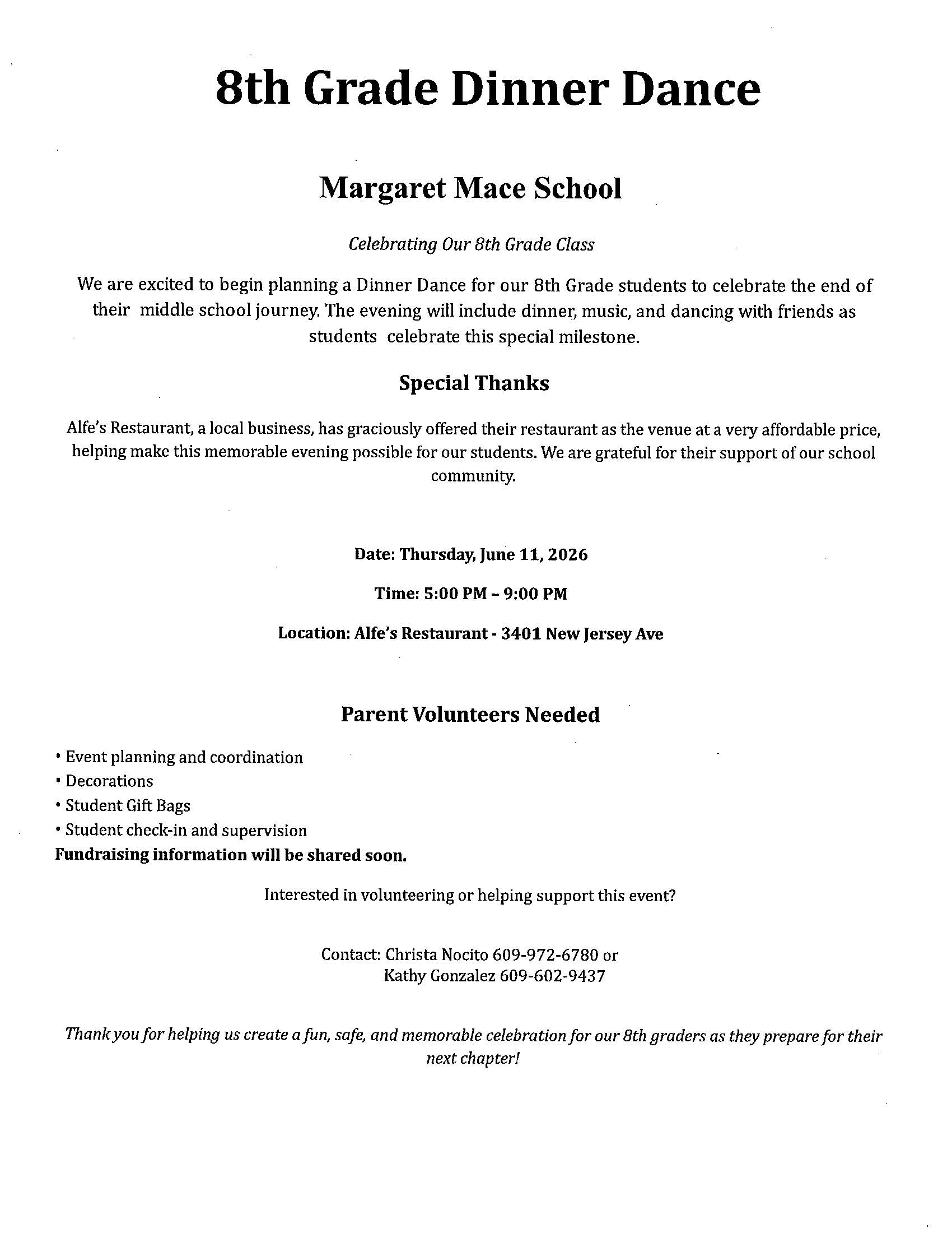 Margaret Mace School will have early dismissal (12:15 PM) on Thursday, April 2nd and will be closed beginning Friday, April 3rd through Friday, April 10th. Staff and Students will return to a full day session on Monday, April 13th.